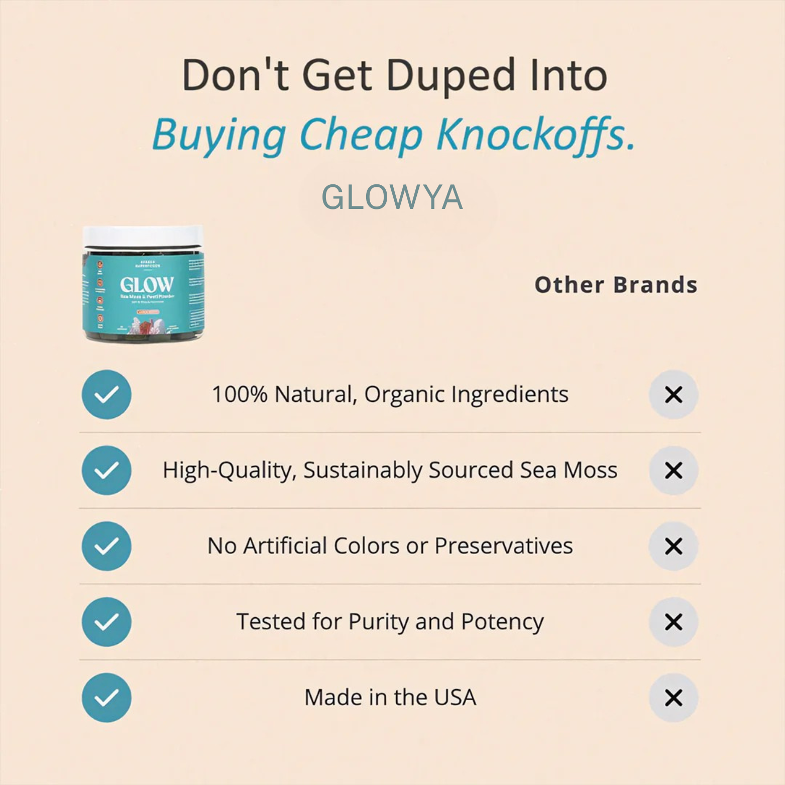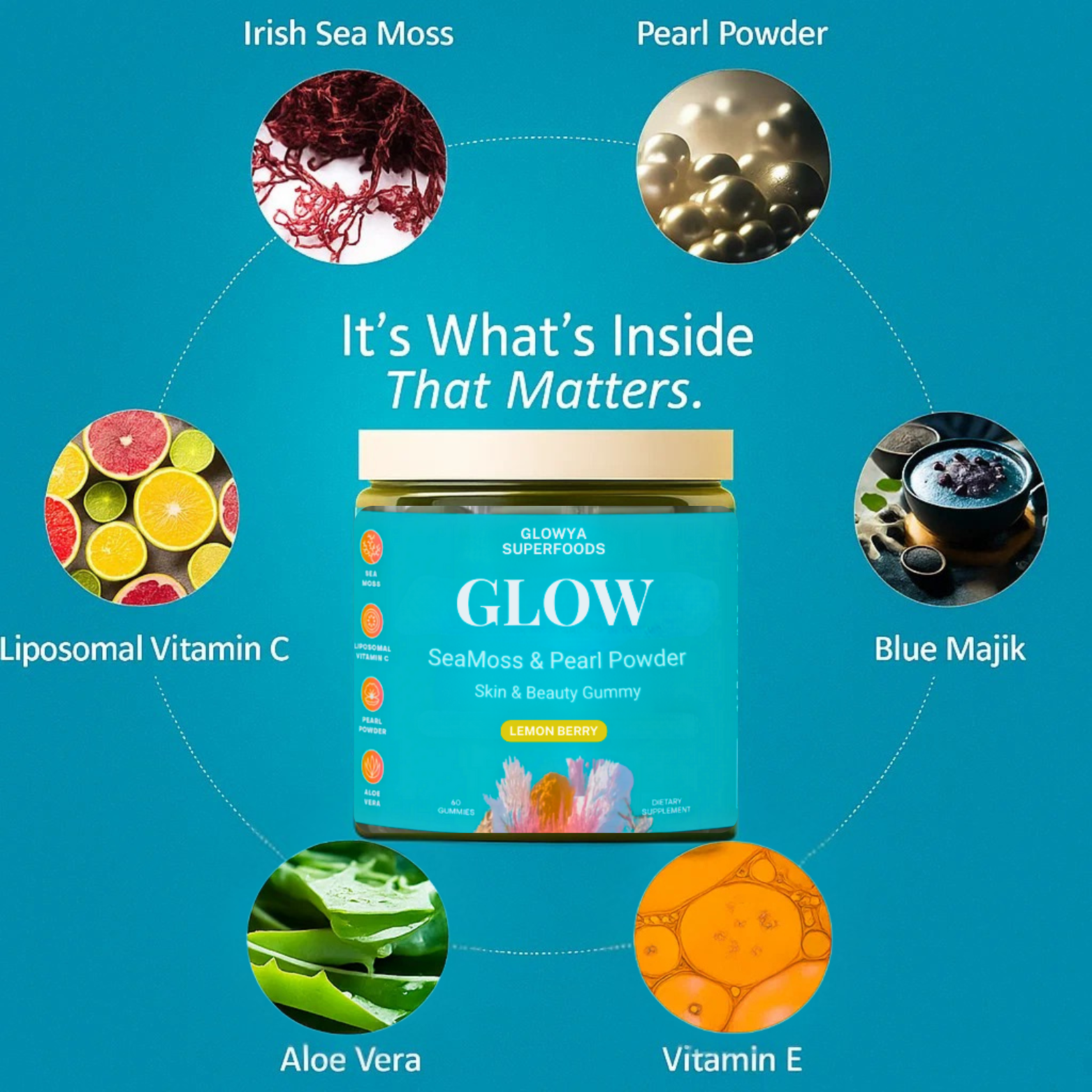 While others toss in trendy buzzwords, we keep it real. Glowya is packed with time-tested ingredients like sea moss and pearl powder in doses that actually do something. No fluff, no gimmicks. Just real glow, from the inside out. You'll feel it. You'll see it. You'll stick with it.